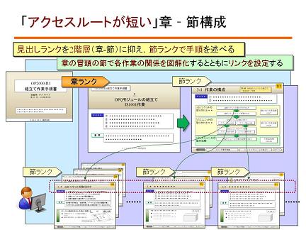 「電子文書ならばキーワード検索を使えるではないか」とのご指摘もあるかもしれません。ただ、電子マニュアルでの検索機能は印刷文書の用語索引の位置付けにとどめ、目次の代替とはしないのが適当と言えます。むしろ、検索機能に依存しない「見出し名と見出しの関係が“見えざるガイド”となって利用者を適切に誘導する見出し構成」が求められます。