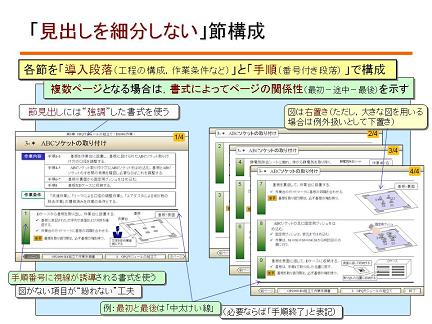 PCに比べ画面が狭いタブレット端末で閲覧する電子マニュアルの場合、不要に見出しを細分せず見出しランクを2階層(章−節)に抑えるのが適当です。見出しを細分すると、「目次が複雑になり、必要な項目を見つけづらい」あるいは「セクションが長くなり、理解に負担がかかりやすい」などの弊害を生じます。 |