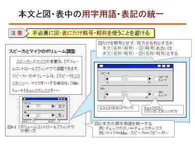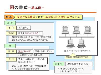 マニュアルで用いられる図には、さまざまな形態(構造図、概念図など)があります。基本の書式を統一するとともに、それぞれの図からも要点(あるいは要点への補足)が読みとれる工夫が適当です。わかりやすい図の工夫は、「図解」に通じます。